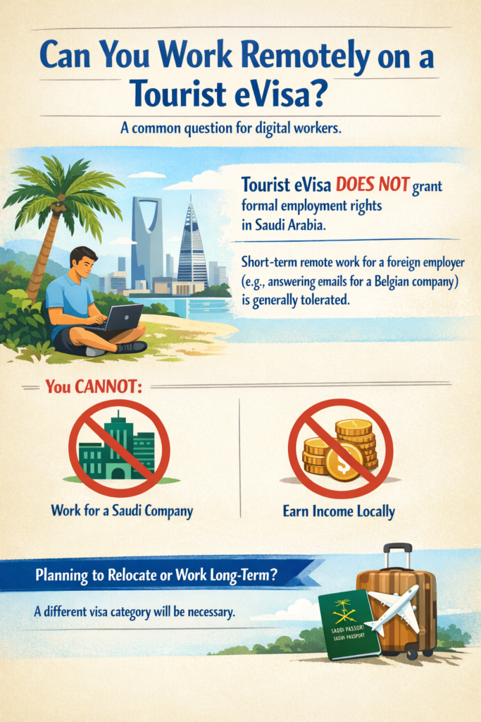 The tourist eVisa does not grant formal employment rights inside Saudi Arabia. However, short-term remote work for a foreign employer (for example, answering emails or working online for a Belgian company) is generally tolerated.You cannot: